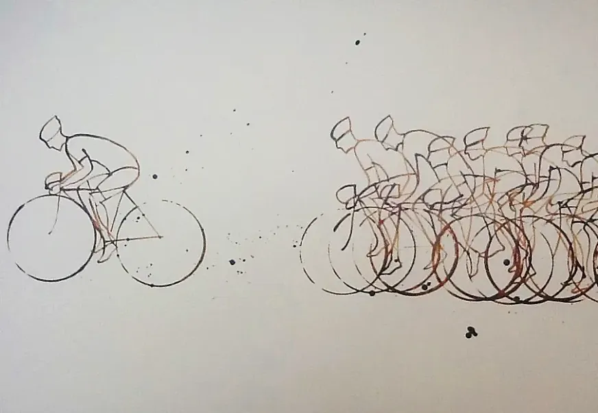 El propio café es, también, parte física de su obra. “Mi trabajo une una rápida serie de pinceladas de café, aliadas con la forma de una taza”, explica. “Creo que es un método perfecto para mostrar la energía cinética del pelotón”.